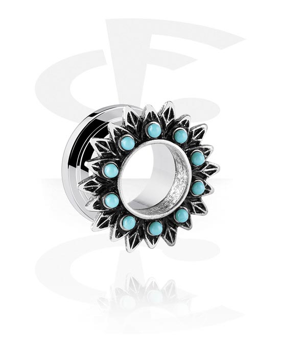 Šroubovací tunel (chirurgická ocel, stříbrná, lesklý povrch) s designem květina a tyrkysovými kamínky