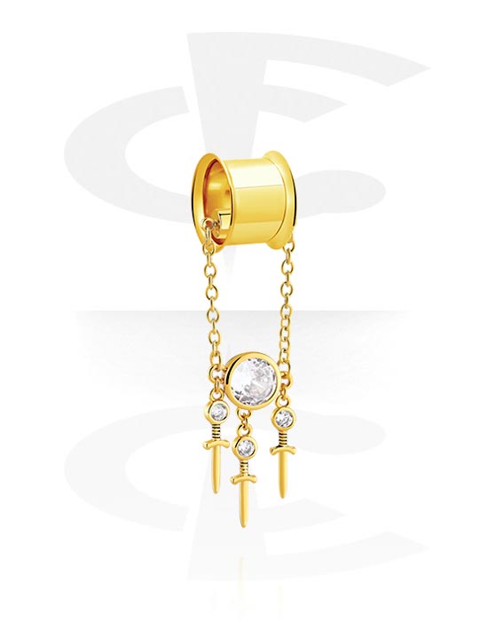 Tunel s rozšířenými konci (chirurgická ocel, zlatá, lesklý povrch) s designem meč a krystalovými kamínky