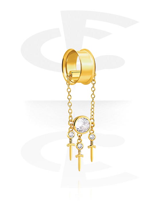 Tunel s rozšířenými konci (chirurgická ocel, zlatá, lesklý povrch) s designem meč a krystalovými kamínky