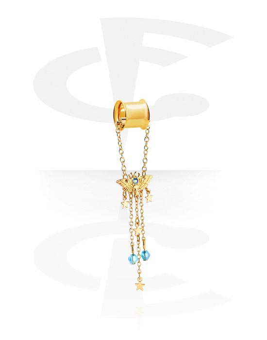 Tunel s rozšířenými konci (chirurgická ocel, zlatá, lesklý povrch) s přívěskem motýl a krystalovými kamínky