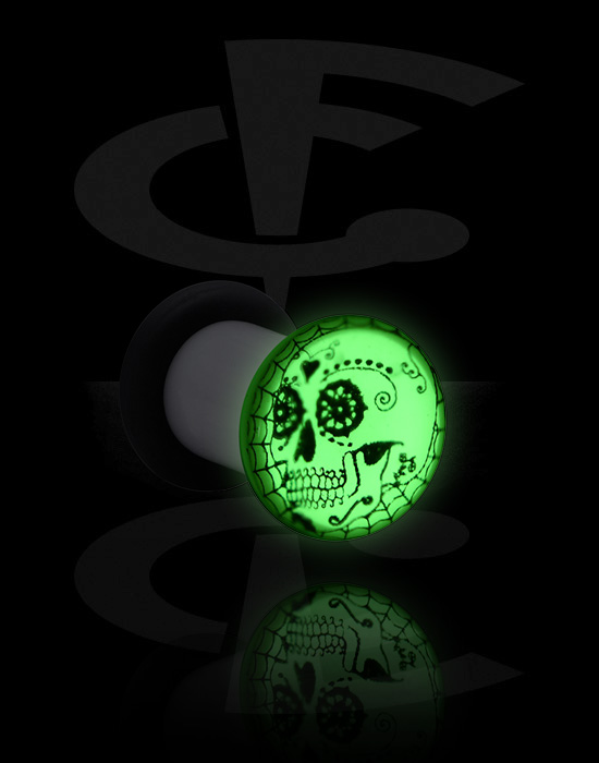Plug s rozšířeným koncem „Zářící ve tmě“ (akryl) s designem černobílá cukrová lebka „Dia de Los Muertos“