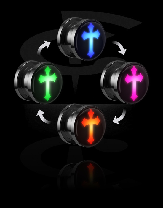 Šroubovací tunel (chirurgická ocel, stříbrná, lesklý povrch) s LED koncovkou a motivem kříž