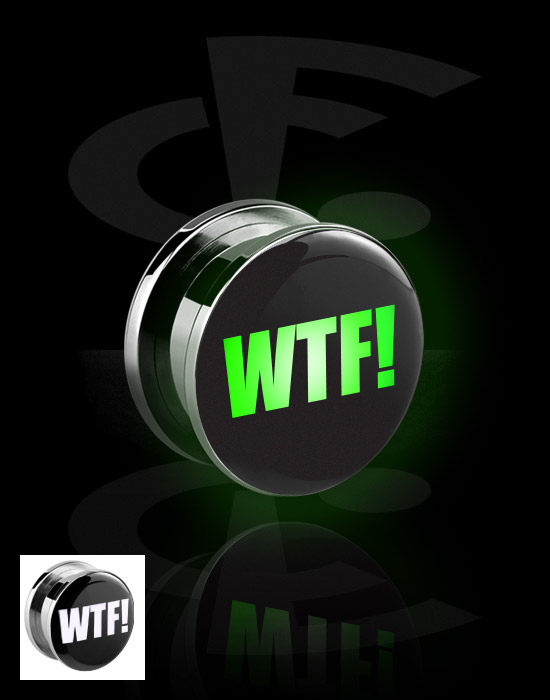 Šroubovací tunel (chirurgická ocel, černá, lesklý povrch) s LED koncovkou a nápisem „WTF!“