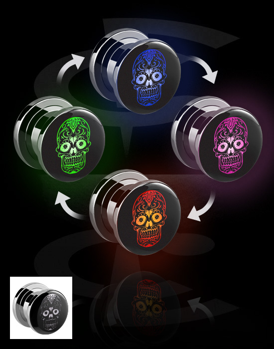 Šroubovací tunel (chirurgická ocel, stříbrná, lesklý povrch) s LED koncovkou a designem černobílá cukrová lebka „Dia de Los Muertos“