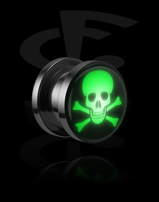 Šroubovací tunel (chirurgická ocel, stříbrná, lesklý povrch) s LED koncovkou a designem lebka