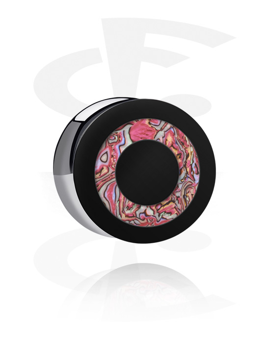 Plug s rozšířenými konci (akryl, černá) s designem kruh a vložkou imitace perleti