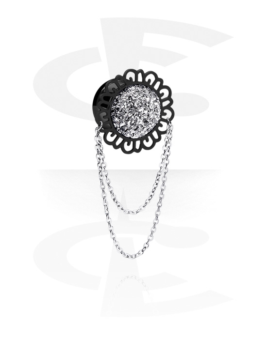 Tunel s rozšířenými konci (chirurgická ocel, černá, lesklý povrch) s vintage designem a řetízkem