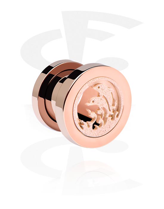 Šroubovací tunel (chirurgická ocel, růžové zlato, lesklý povrch) s designem delfín