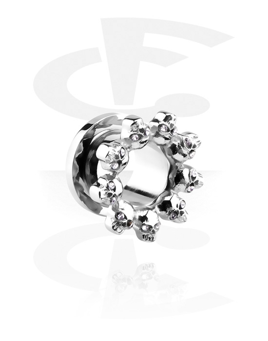 Šroubovací tunel (chirurgická ocel, stříbrná, lesklý povrch) s koncovkou lebka a krystalovými kamínky
