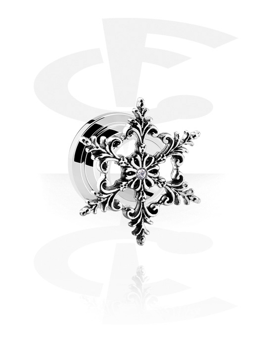 Šroubovací tunel (chirurgická ocel, stříbrná, lesklý povrch) s ornamentem a krystalovým kamínkem