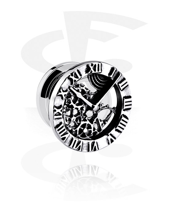 Šroubovací tunel (chirurgická ocel, stříbrná, lesklý povrch) s designem vintage hodiny