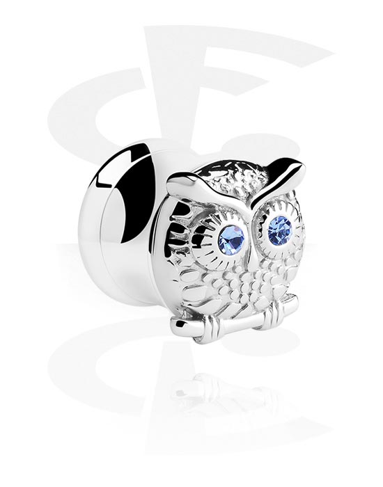 Tunel s rozšířenými konci (chirurgická ocel, stříbrná, lesklý povrch) s koncovkou sova a krystalovými kamínky
