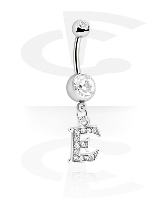 Kroužek do pupíku (chirurgická ocel, stříbrná, lesklý povrch) s přívěskem s písmenem „E“ a krystalovými kamínky