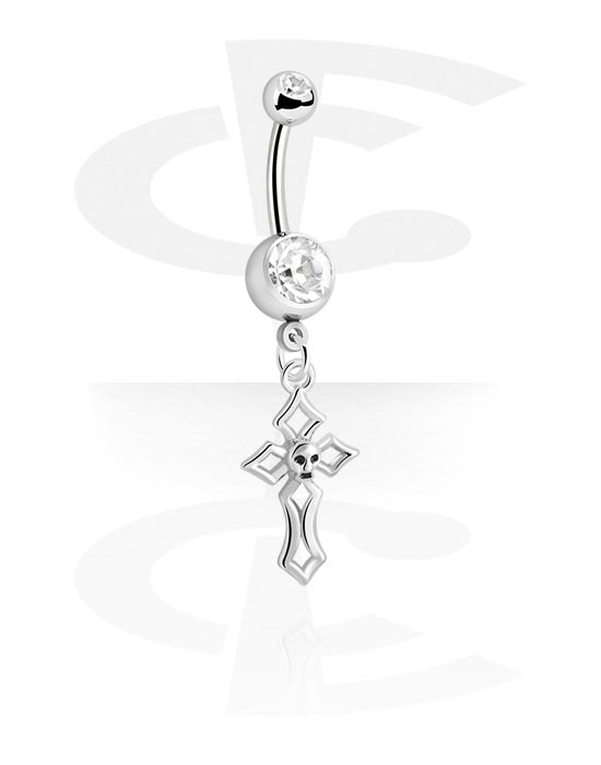 Kroužek do pupíku (chirurgická ocel, stříbrná, lesklý povrch) s přívěskem kříž a krystalovými kamínky