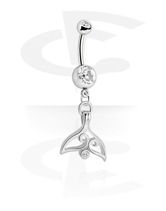 Kroužek do pupíku (chirurgická ocel, stříbrná, lesklý povrch) s přívěskem ocasní ploutev a krystalovými kamínky