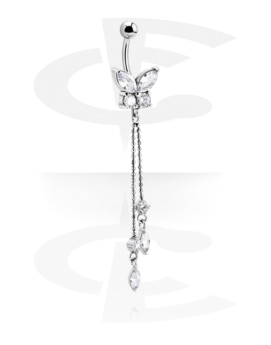 Kroužek do pupíku (chirurgická ocel, stříbrná, lesklý povrch) s designem motýl a řetízkem
