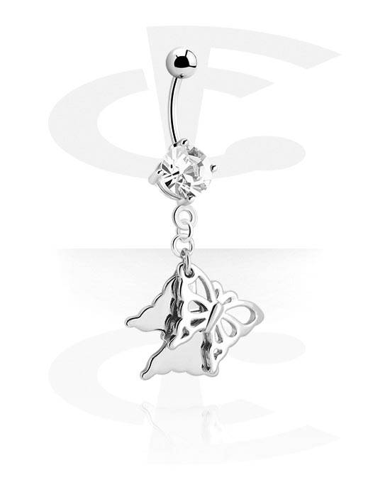 Kroužek do pupíku (chirurgická ocel, stříbrná, lesklý povrch) s přívěskem motýl a krystalovým kamínkem