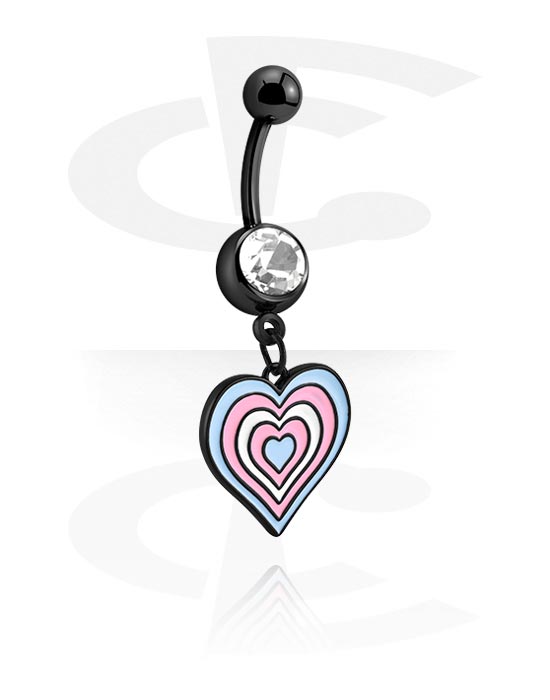 Kroužek do pupíku (chirurgická ocel, černá, lesklý povrch) s přívěskem srdce a krystalovým kamínkem