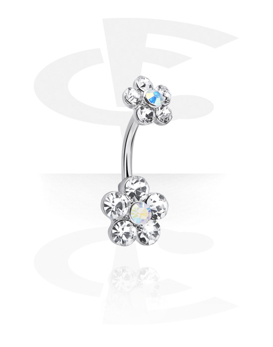 Kroužek do pupíku (chirurgická ocel, stříbrná, lesklý povrch) s designem květina a krystalovými kamínky