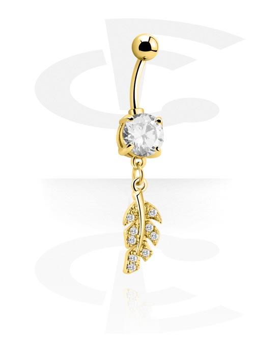 Kroužek do pupíku (chirurgická ocel, zlatá, lesklý povrch) s přívěskem list a krystalovými kamínky