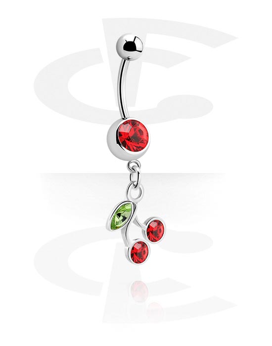 Kroužek do pupíku (chirurgická ocel, stříbrná, lesklý povrch) s přívěskem třešeň a krystalovými kamínky