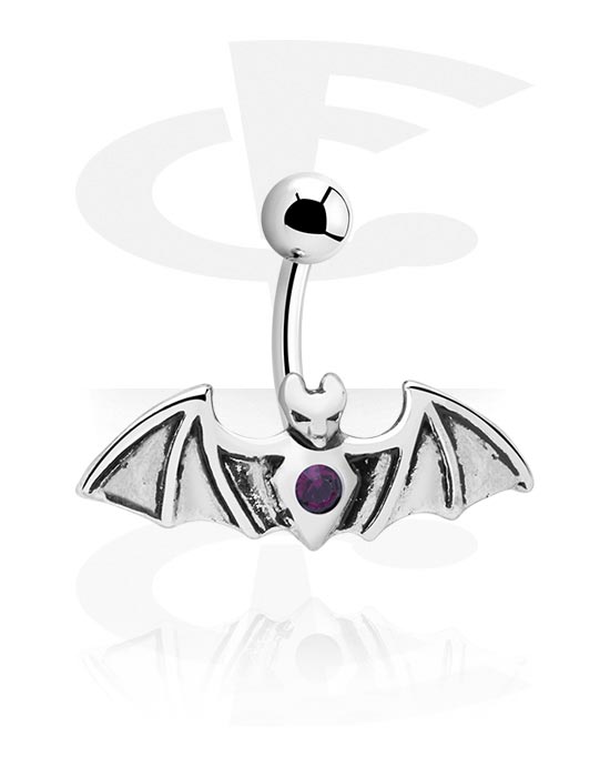 Kroužek do pupíku (chirurgická ocel, černá, lesklý povrch) s designem netopýr a krystalovým kamínkem