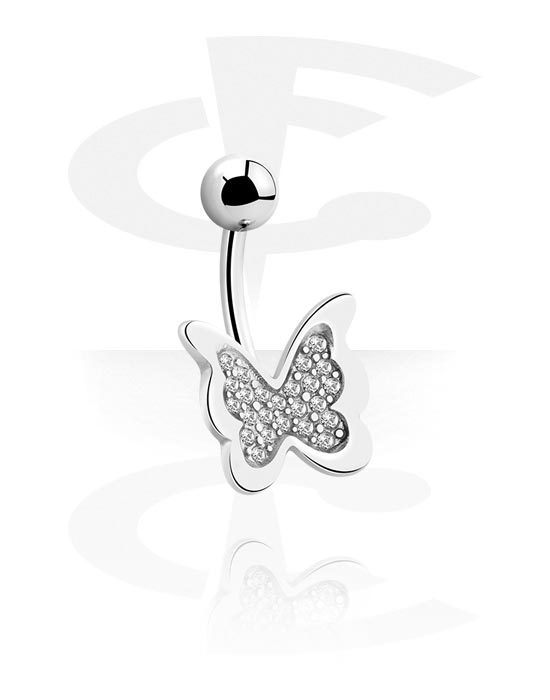Kroužek do pupíku (chirurgická ocel, stříbrná, lesklý povrch) s designem motýl a krystalovými kamínky