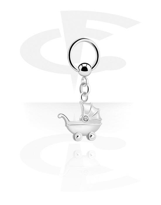 Kroužek s kuličkou (chirurgická ocel, stříbrná, lesklý povrch) s přívěskem kočárek a krystalovým kamínkem