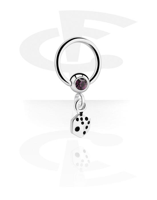 Kroužek s kuličkou (chirurgická ocel, stříbrná, lesklý povrch) s krystalovým kamínkem a přívěskem kostka