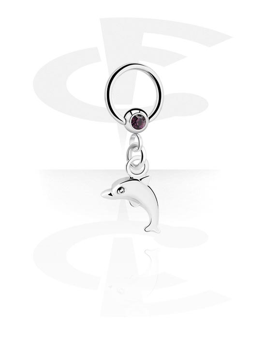 Kroužek s kuličkou (chirurgická ocel, stříbrná, lesklý povrch) s krystalovým kamínkem a přívěskem delfín