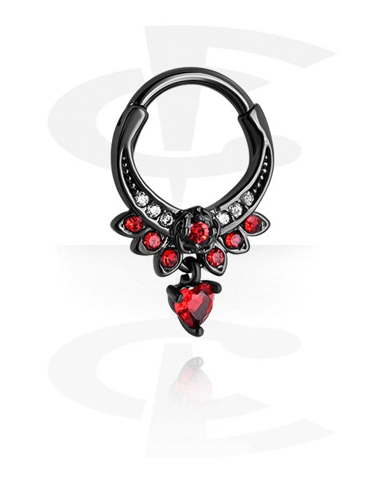 Piercingový clicker (chirurgická ocel, černá, lesklý povrch) s přívěskem srdce a krystalovými kamínky