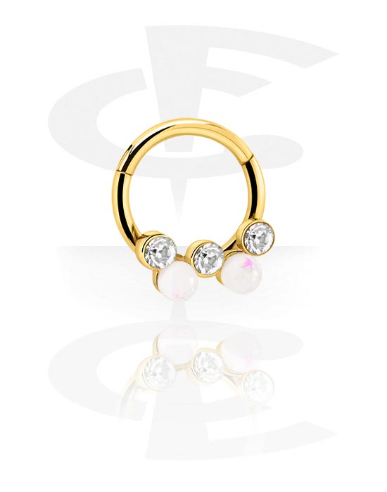 Piercingový clicker (chirurgická ocel, zlatá, lesklý povrch) s krystalovými kamínky a syntetickým opálem