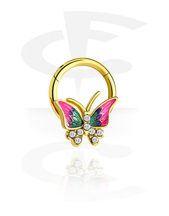 Piercingový clicker (chirurgická ocel, zlatá, lesklý povrch) s designem motýl a krystalovými kamínky