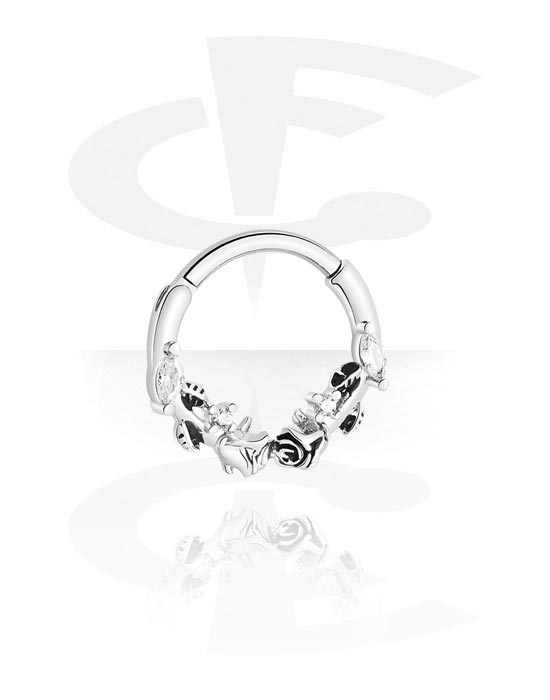 Piercingový clicker (chirurgická ocel, stříbrná, lesklý povrch) s designem růže a krystalovými kamínky
