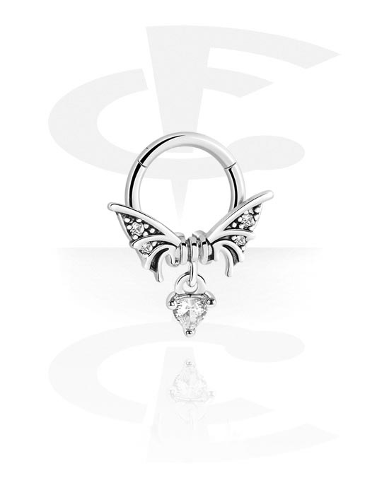 Piercingový clicker (chirurgická ocel, stříbrná, lesklý povrch) s designem křídlo a krystalovým srdcem
