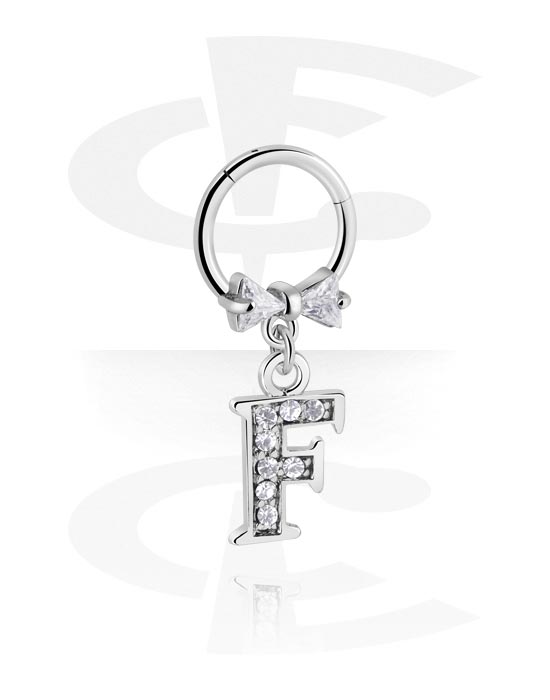 Piercingový clicker (chirurgická ocel, stříbrná, lesklý povrch) s lukem a přívěskem s písmenem „F“