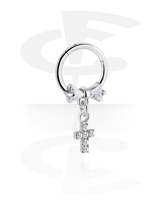 Piercingový clicker (chirurgická ocel, stříbrná, lesklý povrch) s lukem a přívěskem kříž