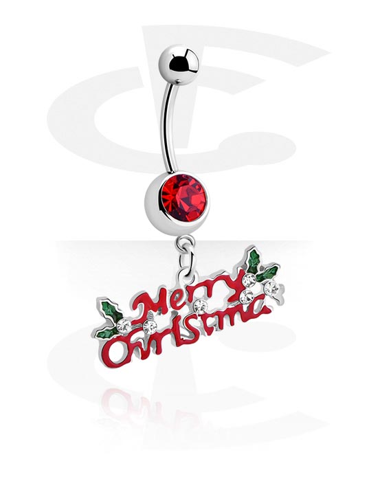 Navlering (kirurgisk stål, sølv, blank finish) med Tekst: "Merry Christmas" og Krystalsten