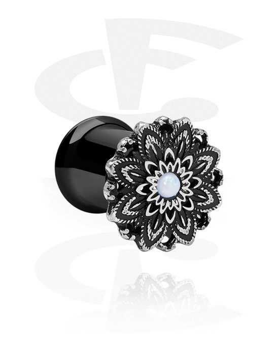 Double-flared tunnel (kirurgisk stål, sort, blank finish) med blomsterfront og perlemorssten