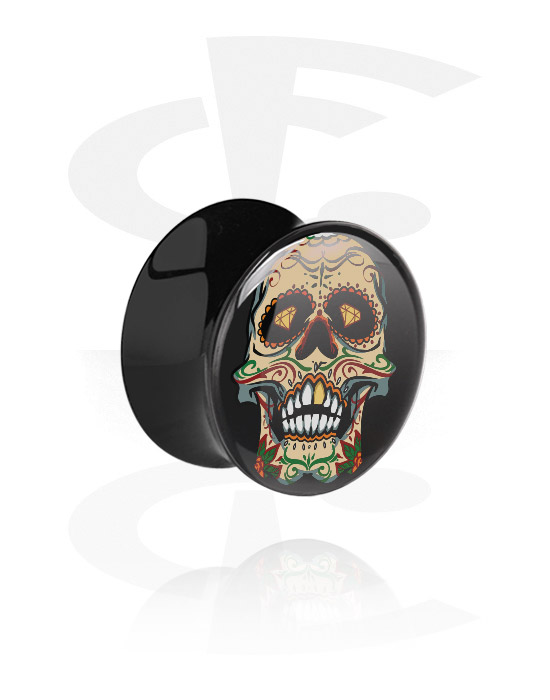 Black flared plug made of acrylic, featuring a multicoloured ornamental skull with a diabolic grin. Too charming!
