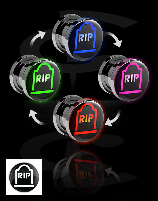Tunnel, der skrues på (kirurgisk stål, sølv, blank finish) med gravsten med tekst: RIP