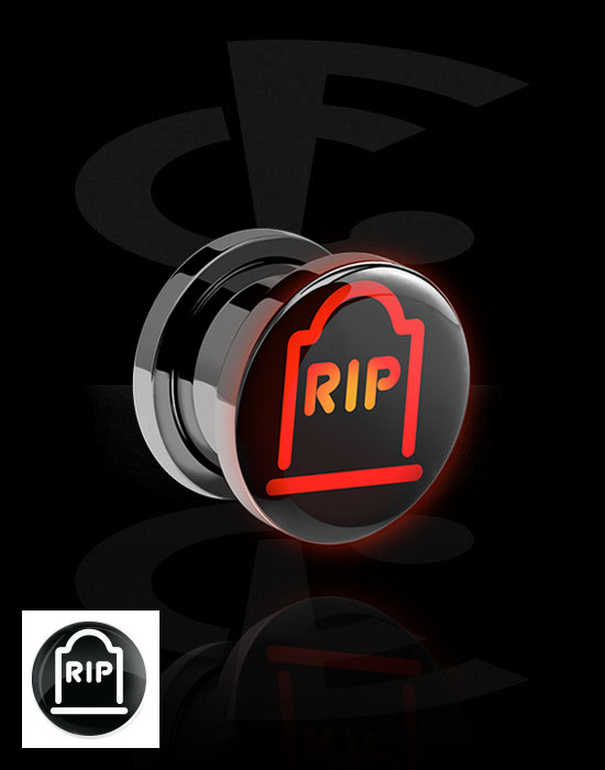 Tunnel, der skrues på (kirurgisk stål, sølv, blank finish) med gravsten med tekst: RIP
