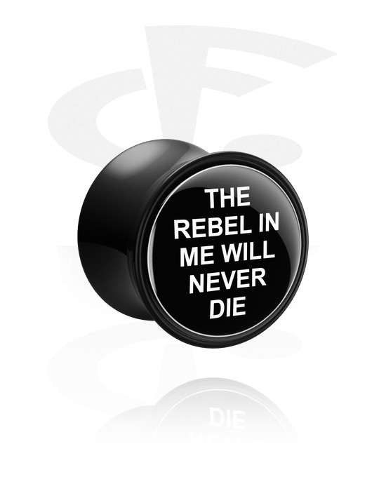 Double-flared plug (akryl, sort) med Tekst: "The rebel in me will never die"