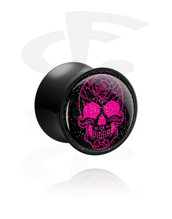 Double-flared plug (akryl, sort) med sugar skull "Dia de Los Muertos"-motiv i flere farver
