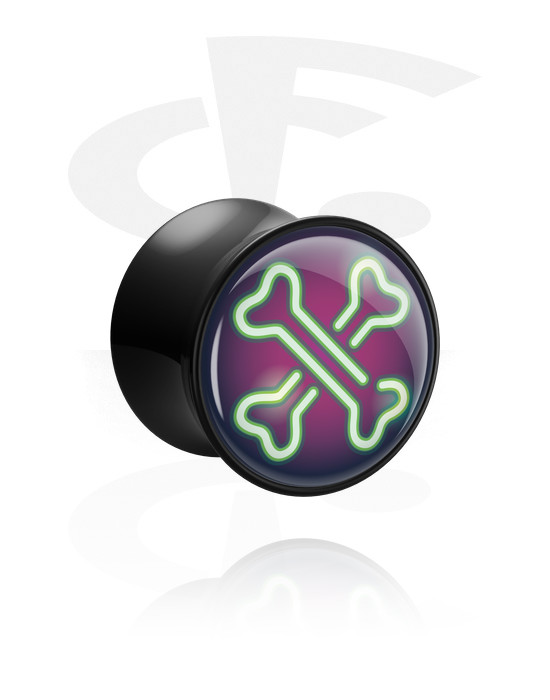 Double-flared plug (akryl, sort) med neonfarvet halloweenmotiv "korslagte knogler"