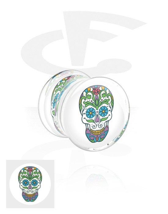 Double-flared plug (akryl, transparent) med farverig sugar skull "Dia de Los Muertos"-motiv