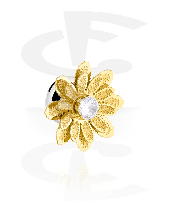 Double-flared tunnel (kirurgisk stål, sølv, blank finish) med vedhæng med gylden blomst og Krystalsten