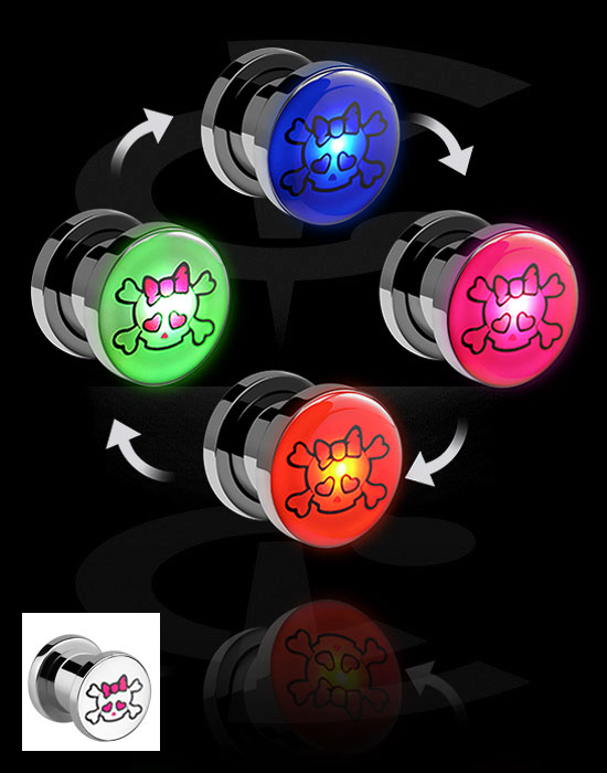 Tunnel, der skrues på (kirurgisk stål, sølv, blank finish) med LED-vedhæng og Dødningehovedmotiv