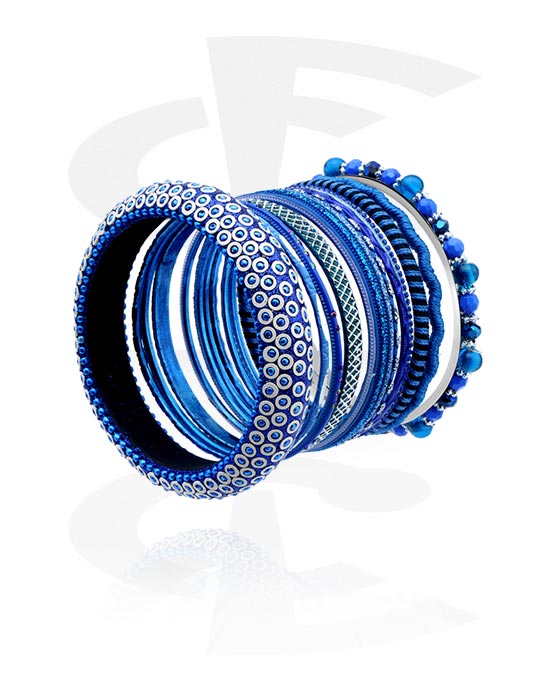 This set contains 13 bangles made from resin, glass, plated brass and aluminium. The diameter is 6.7 cm.
