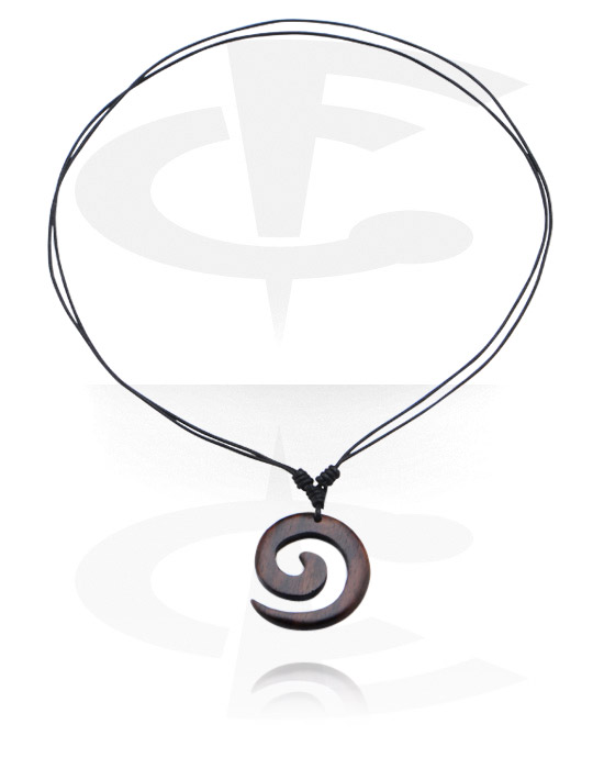 Wooden spiral pendant on a dark leather cord necklace. With handcrafted products made from organic materials, slight variations in size, colour and shape may occur.